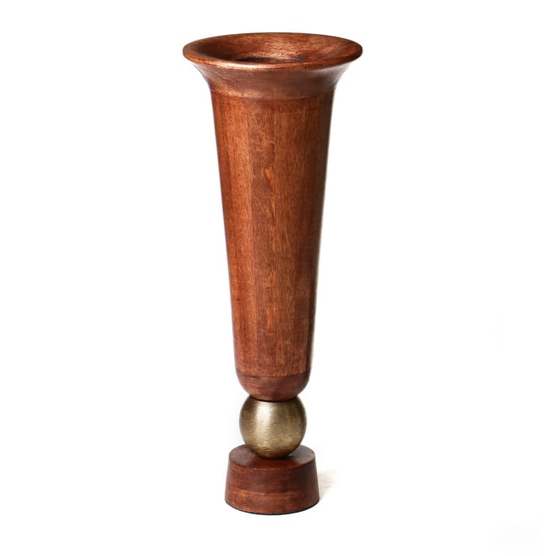 مزهرية خشبية عالية بتصميم بوقي وقاعدة مزينة بكرة معدنية ذهبية — لمسة فاخرة بطابع دافئ.